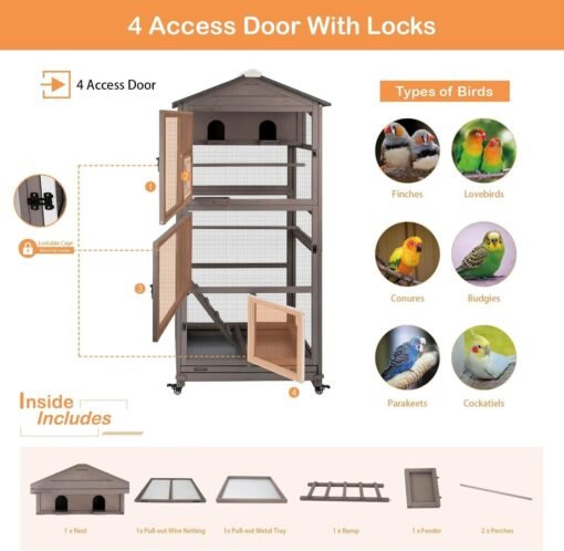 PETSCOSSET PET50 68.8″L Wooden Bird Cage Outdoor Bird Aviary Indoor Large Parakeet Cage on Wheels,Brown